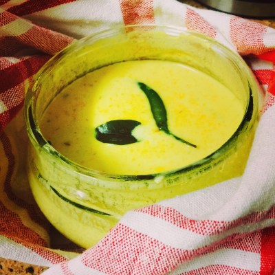 Step 2: Blend the buttermilk along with the ginger-garlic paste, chopped green chillies, turmeric, salt and jeera. Pour this mixture into the pan and keep stirring on low flame for about 5 minutes, until it’s done.